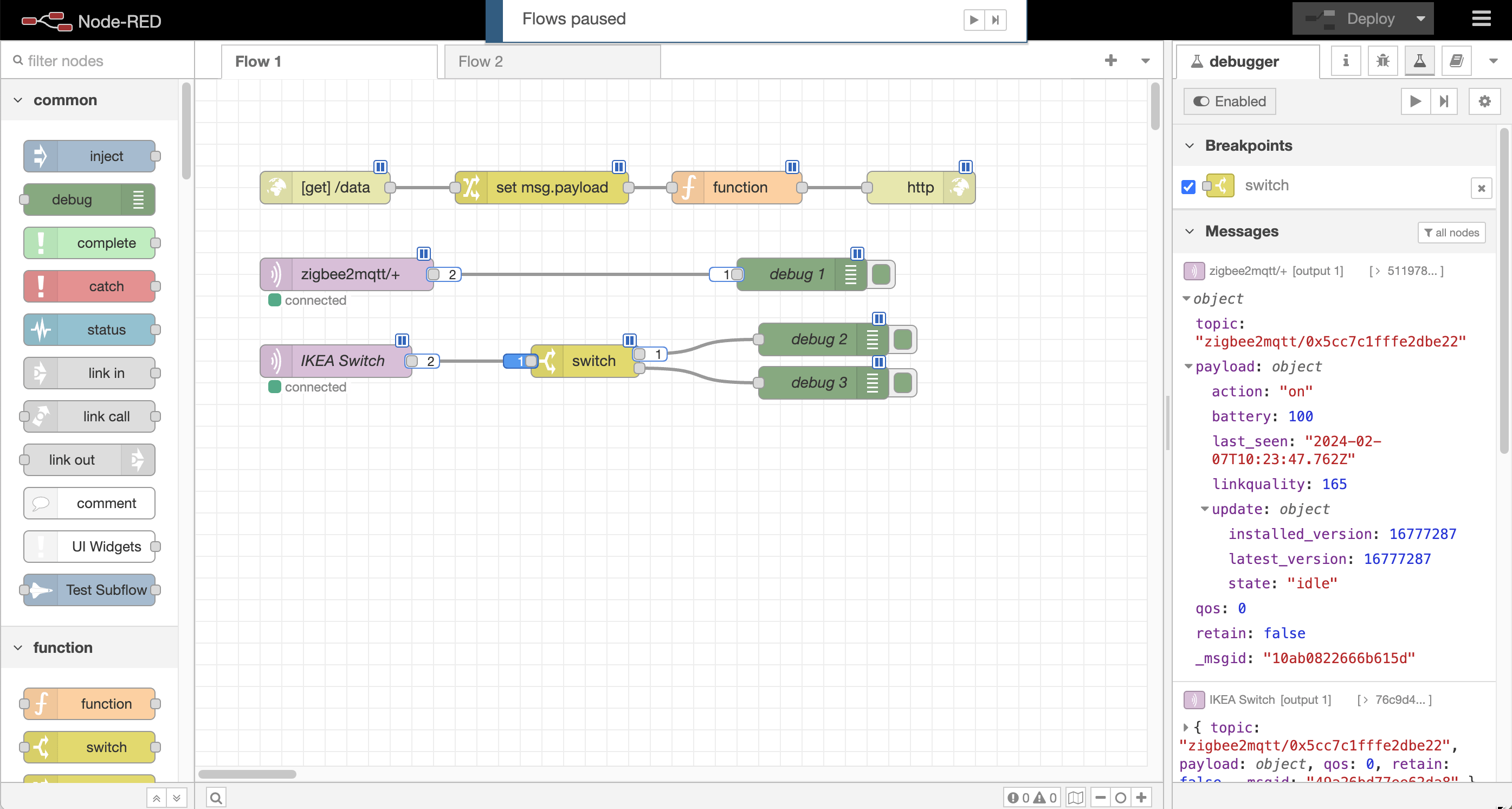 The alternative approach is Step-by-Step debugging. This is why you are able to pause the program and then step it forward one statement at a time - examining the state at each point. But what's the equivalent for low-code? Pretty much exactly that when you have the Node-RED Debugger plugin installed.